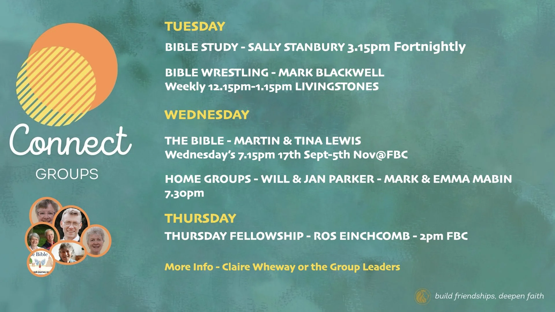 NEWS - The Bible Wrestling Connect Group has moved back to Tuesday. Same place : LivingStones, Same time : 12.15-1.15pm